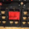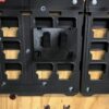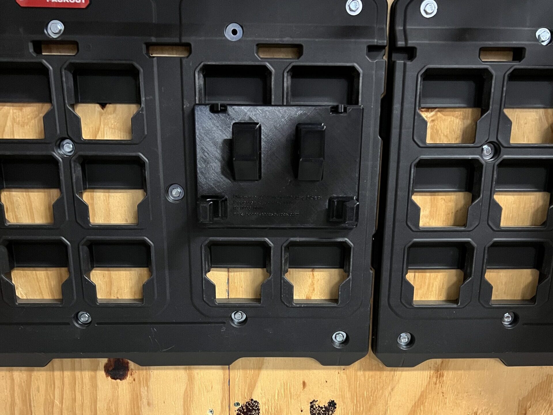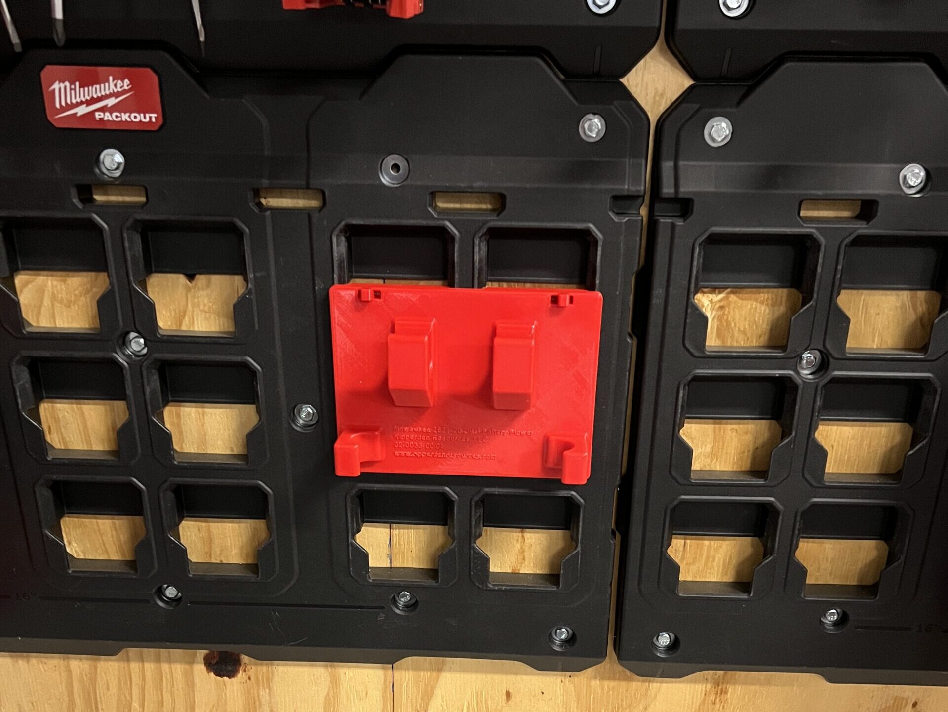 The Packout version is secured to the Packout wall system and automatically latches into place. It can be easily removed using release tabs. The mount takes up four slots (2 columns and 2 rows) of a Packout Wall plate. If you install it in the bottom rows of the plate, there is room to add other mounting accessories in the row above it.