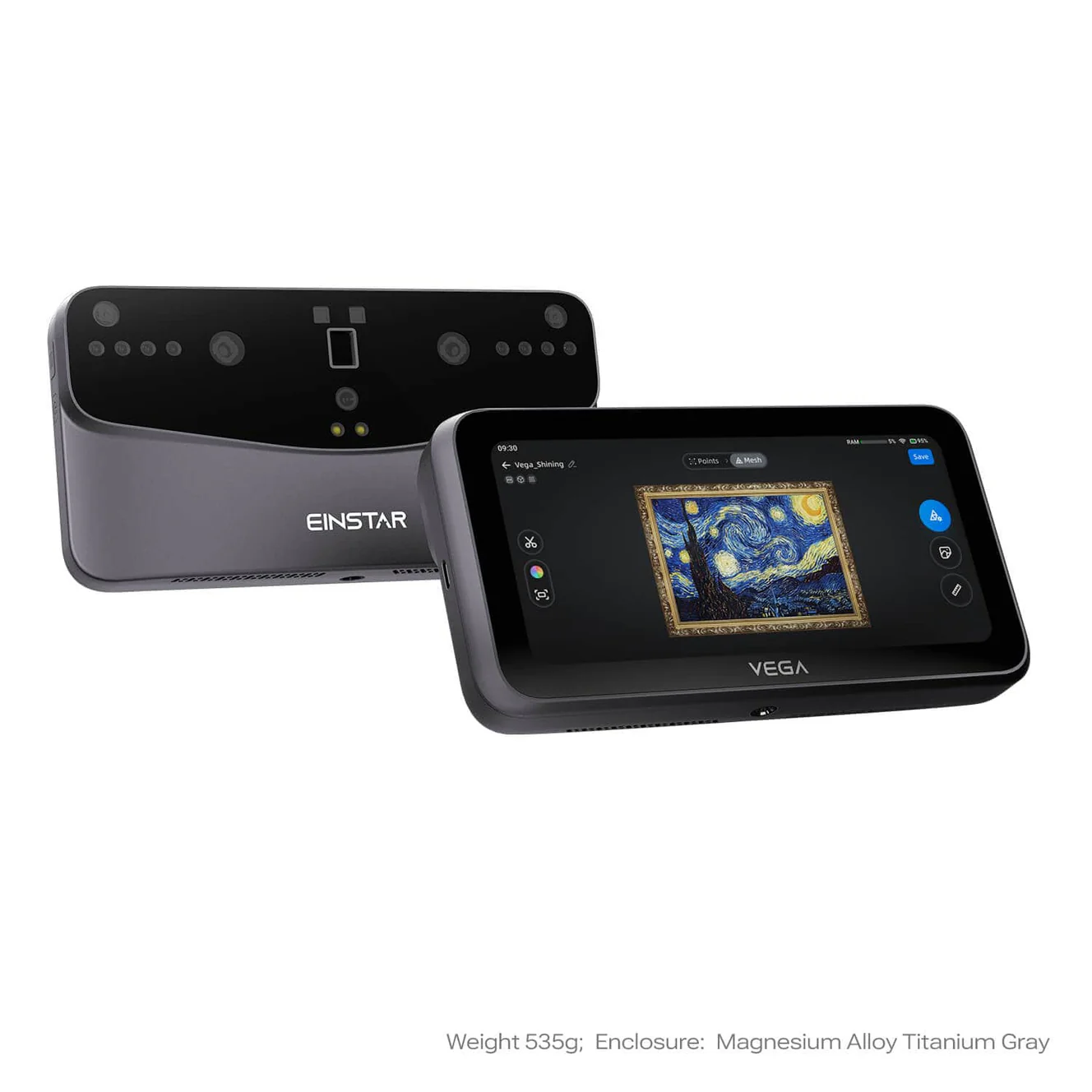 The Shining 3D Einstar Vega is a pocket-sized, wireless all-in-one 3D scanner that lets you scan, process, edit, and export 3D models entirely on the device — no laptop, no cables, no limits. With dual scanning technologies, a 48MP color camera, and a 6.4″ 2K AMOLED touchscreen, the Vega delivers professional-grade scanning in a device that weighs just 535g and fits in your hand.